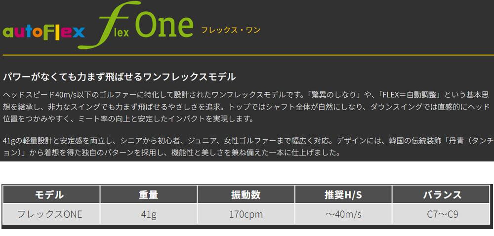 ヘッドスピード40m/s以下のゴルファーに特化して設計されたワンフレックスモデルです。「驚異のしなり」や、「FLEX=自動調整」という基本思想を継承し、非力なスイングでも力まず飛ばせるやさしさを追求。トップではシャフト全体が自然にしなり、ダウンスイングでは直感的にヘッド位置をつかみやすく、ミート率の向上と安定したインパクトを実現します。